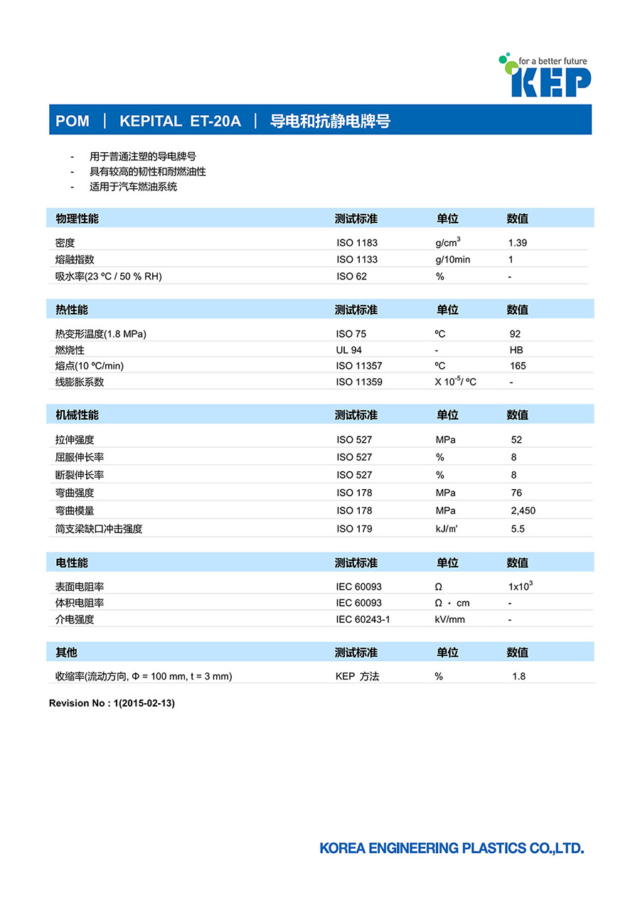 ET-20A 共聚甲醛(POM)  |  韓國工程塑料(株)  |  導(dǎo)電性、耐燃油性