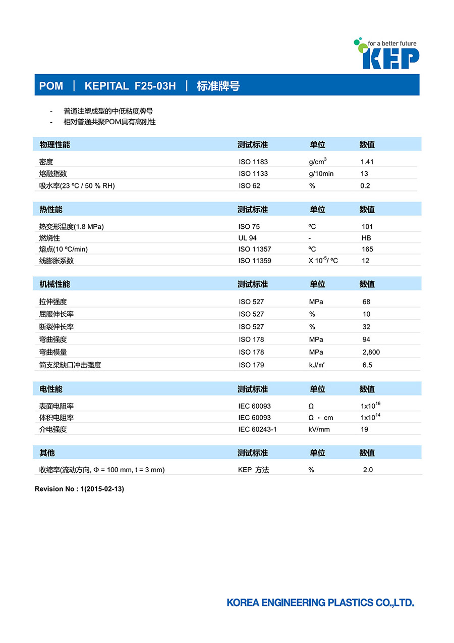 F25-03H 共聚甲醛(POM)  |  韓國工程塑料(株)  |  高剛性中低粘度