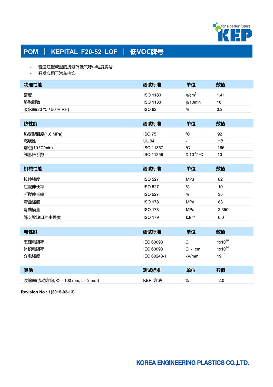 F20-52 LOF 共聚甲醛(POM)  |  韓國(guó)工程塑料(株)  |  耐UV、低VOC