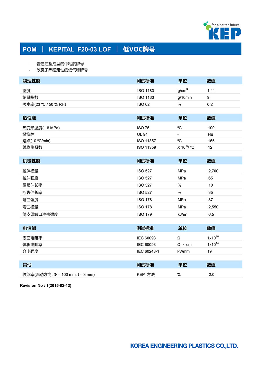 F20-03 LOF 共聚甲醛(POM)  |  韓國工程塑料(株)  |  普通中粘度、低VOC
